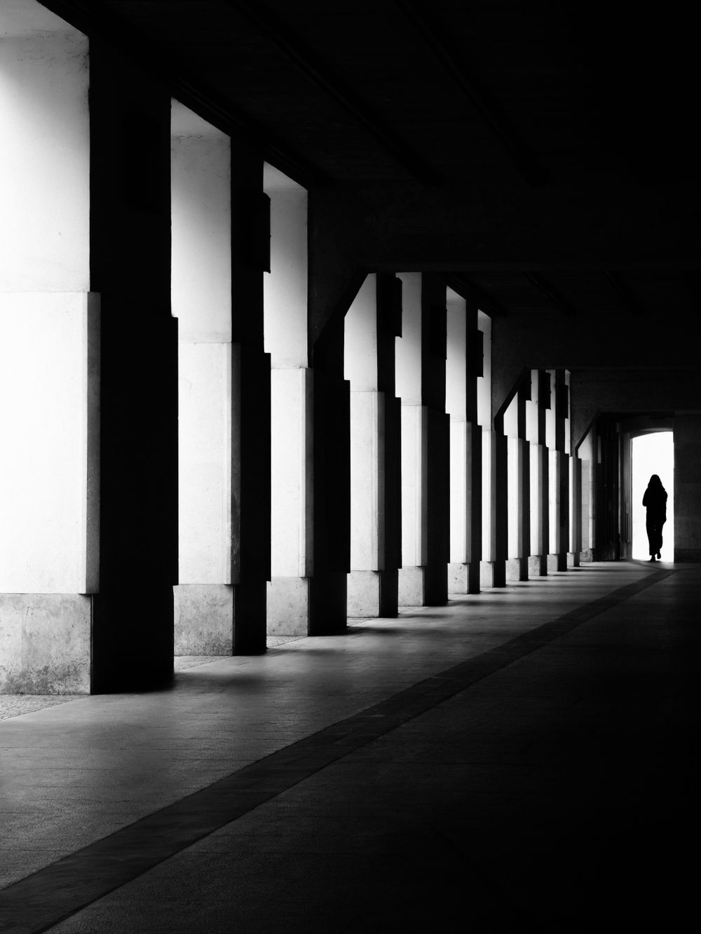 A lone figure walks through the arcades, framed by repeating columns and a flood of light at the end. Under the Arcades captures the meeting of geometry and emotion - where structure guides the eye and light defines the mood. The photograph’s deep contrasts and calm rhythm make it an elegant, timeless study in space and solitude. Ideal for modern interiors, design lovers, and anyone drawn to minimalist architecture and poetic light.