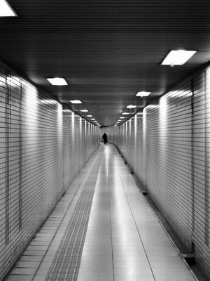 A long corridor reduced to repetition, lines, and a single figure at the far end. The perspective does most of the work. It turns an ordinary passage into something measured and cinematic, with just enough human scale to keep the geometry from feeling cold.